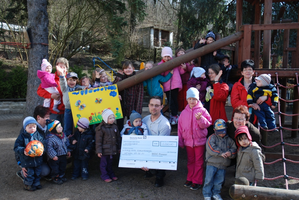 Spendenübergabe an die Ev. Kita Am 23. März bekam unsere Kindertagesstätte freundlichen Besuch von zwei Vertretern der Firma MDC Power GmbH aus Kölleda. In der Firma ist es üblich, dass die Mitarbeiterinnen und Mitarbeiter einmal jährlich ihren Verdienst für gute Zwecke zur Verfügung stellen. Da ein Vater eines Kindes aus unserer Einrichtung dort arbeitet, hatte er den Vorschlag gemacht, dass ein Teil dieses Geldes unserer Kindertagesstätte zugute kommt. Glücklicherweise kam also unsere Kita in die Auswahl derer, die einen Teil des in diesem Jahr erarbeiteten Geldes bekommen. So konnten wir einen großen Scheck über tausend Euro entgegennehmen, der für die Gestaltung der Außenanlage unserer Kita genutzt werden soll. Die Kinder hatten als Dankeschön ein buntes Frühlingsbild gemalt. Bei dem schönen Frühlingswetter gab es lauter strahlende Gesichter und ein ganz herzliches Dankeschön geht an die Firma MDC Power und ihre Mitarbeiterinnen und Mitarbeiter.