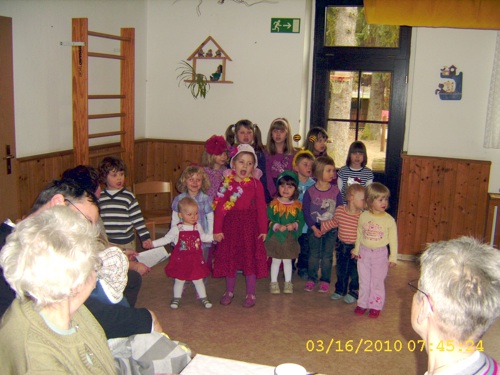 Am 16. März hatten die Kinder und Erzieherinnen unserer Evangelischen Kindertagesstätte die Großeltern nachmittags zum Frühlingsfest eingeladen. Zuerst unterhielten uns die Kinder mit Liedern und Gedichten - ein bunter Reigen von frühlingshaften Versen und Melodien erfreute und erheiterte die Zuhörerinnen und Zuhörer. Alles war gut vorbereitet und klappte reibungslos. Anschließend gab es Kaffee und von manchen Eltern selbst gebackenen leckeren Kuchen. Danke an alle, die dabei mitgeholfen haben. Zum Schluss haben wir nach einer kurzen Andacht noch gemeinsam zur Gitarre Lieder gesungen. Fröhlich gingen Kinder und Großeltern nach einem gelungenen Nachmittag heim.