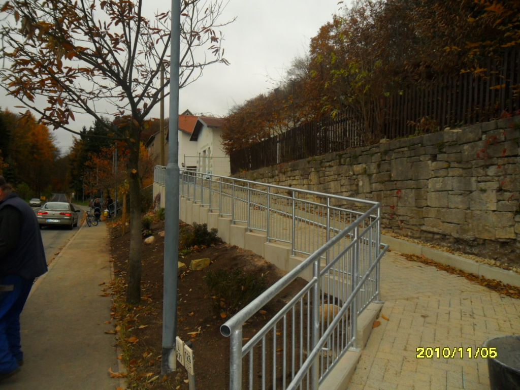 Endlich eine Auffahrt für den Kindergarten Jetzt ist es soweit: Die Kinderwagenauffahrt unserer Evangelischen Kita ist fertig. Damit ist für uns ein großer Wunsch in Erfüllung gegangen. Viele Jahre lang mussten die jungen Mütter die Kinderwagen oder Buggies entweder unten stehen lassen oder mühsam die Treppe hinaufschleppen, wenn sie ihre Kleinen in die Kita brachten. Viel Geduld und Organisationstalent waren nötig, bis wir diese Arbeit überhaupt in Angriff nehmen konnten. Wir sind den Mitarbeiterinnen und Mitarbeitern der Verbandsgemeinde sehr dankbar für die sorgfältige Planung, die dazu geführt hat, dass wir für diese Arbeiten einen hohen Anteil an Fördergeldern bekommen haben. Dann musste die ausführende Firma auch noch viel Zeit und Kraft aufwenden, um die tonnenschwere Wurzel der alten Buche aus dem Boden zu entfernen. Recht schnell war danach die Schräge der Auffahrt zu erkennen, die inzwischen auch gepflastert ist. Inzwischen ist auch das Geländer angebaut. Sogar der Hang ist in ehrenamtlicher Arbeit bereits wieder bepflanzt, so dass das Gelände schon nicht mehr kahl ist. Auch der Zaun ist unter großem körperlichen Einsatz bereits wieder angebracht und wird noch mit einer Tür versehen werden, damit die Auffahrt und das Gelände der Kita sicher für die Kinder sind. Dies soll in der nächsten Zeit noch mit ehrenamtlicher Hilfe erledigt werden. Allen, die mitgeholfen haben, gebührt ein herzliches und tiefempfundenes Dankeschön!